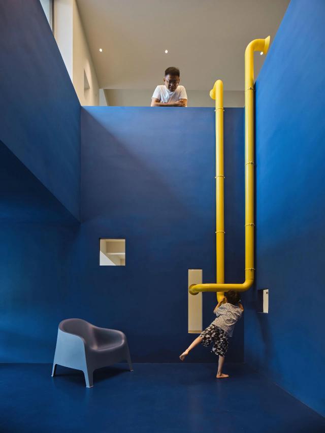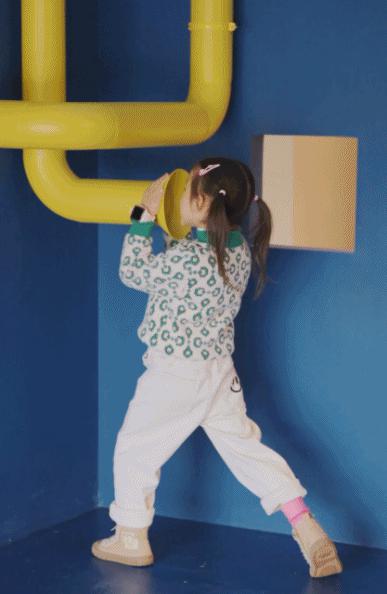 蓝盒空间连接一层室外和二层室内,孔与核心筒的孔相呼应;墙上传声筒设备为室内增添趣味性