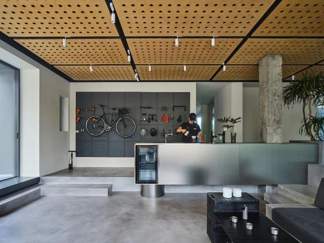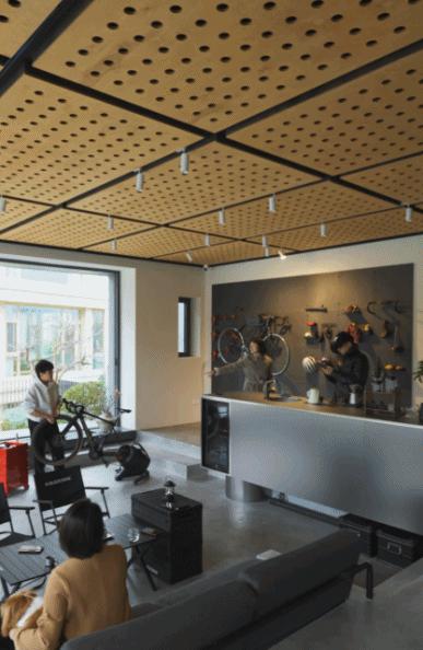车库咖啡厅原有的混凝土裸柱穿插金属台面,形成咖啡制作操作平台;各种配件工具可以放在墙洞板上,也是展厅