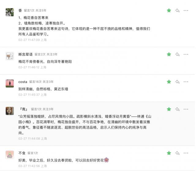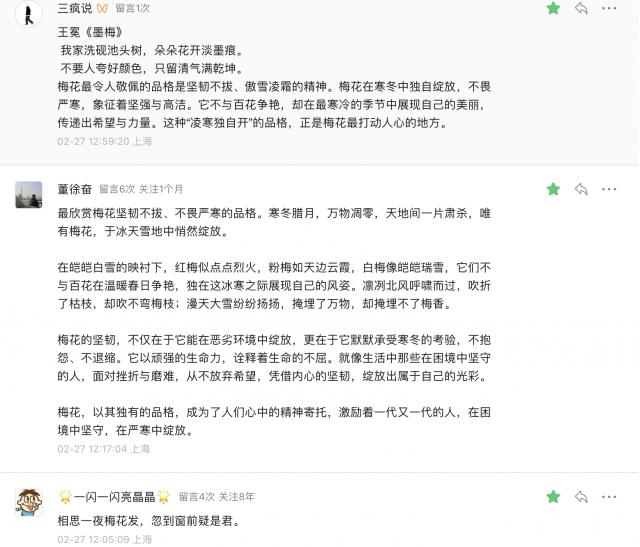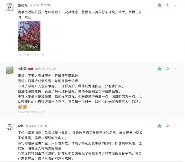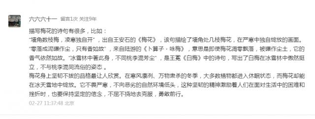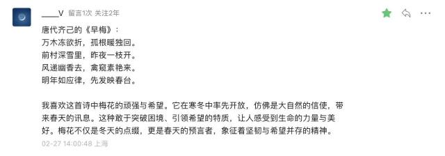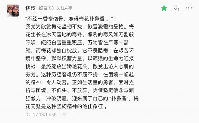 这位网友文采出众,句句珠玑,表达了对梅花不屈不挠、在逆境中绽放的欣赏,也延伸到了梅花在生活困境中努力学习“突破痛苦”的品质,不愧为四年老粉丝!