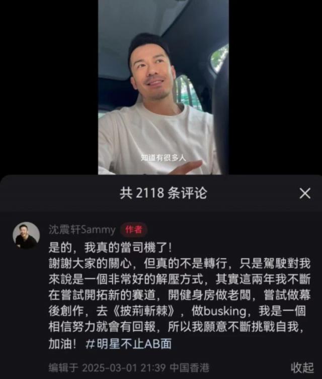 根据香港的报道 41 岁 TVB 演员沈震轩改行开网约车被很多网友偶遇。2025 年 3 月 1 一天晚上,沈震轩在自己的社交账号上发布了一段标题为“是的,我真的是司机”的视频。