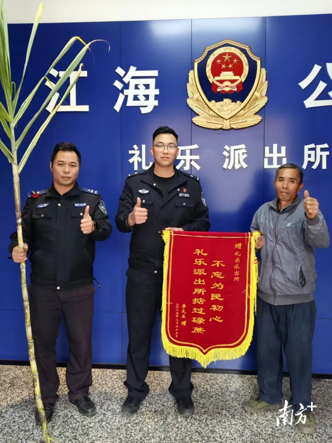 2月23日,李阿伯带着田里最漂亮的甘蔗和一面印着“不忘为民初心,不忘为民初心,”警察同志办案。 送到江门市公安局礼乐派出所的礼乐派出所,称其为“碌蔗”。