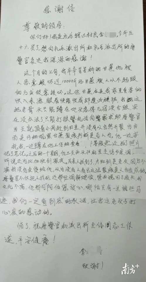 “你放心,唐警察的那句‘阿伯,哪怕只有一点线索,我们一定要找出来’的承诺,这让我这个老人很感动。”最近,一封深情的感谢信被送到了平安厅的邮箱,里面充满了蔗农李阿伯对江门市公安局礼乐派出所民警的感谢,他们尽职尽责地为他们追回了损失。