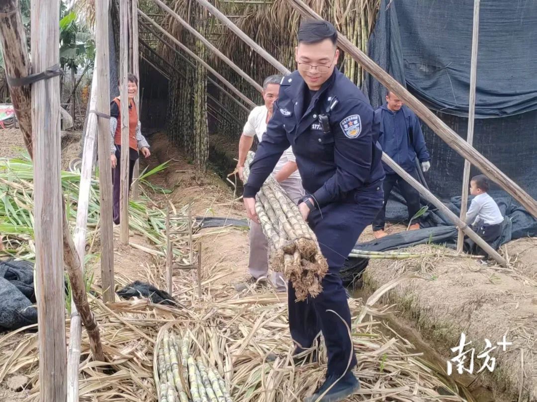 礼乐派出所民警唐张伟正在仔细观察甘蔗损伤的细节。受访者提供图片