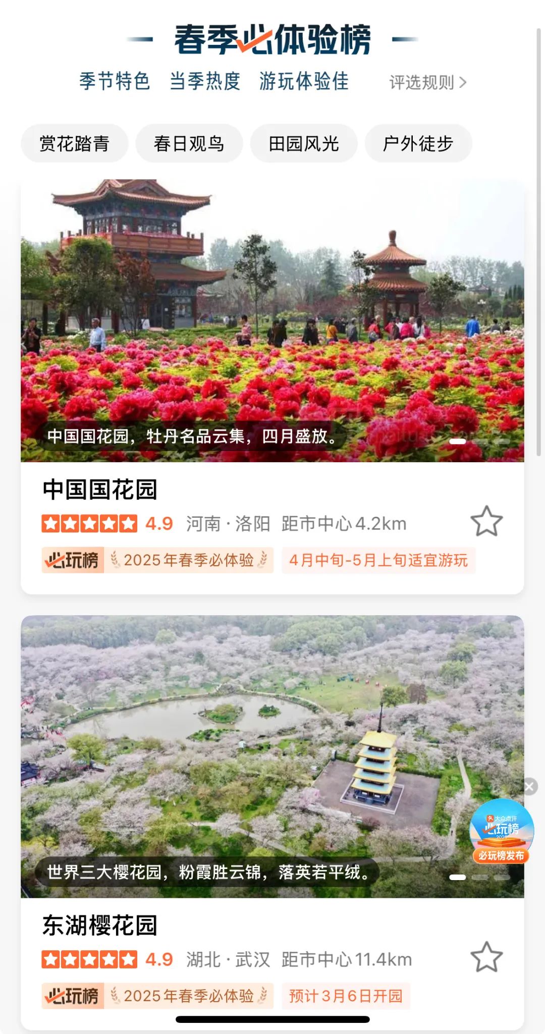 2025年,“必玩榜”还首次推出“季节性感受榜”,按季度发布,为用户选择“季节性特色、人气高、感觉好”的季节性游玩场所,为用户提供“中国四季必玩指南”。春季首发名单包括32个游玩场所:赏花、春季观鸟、田园风光、户外徒步。