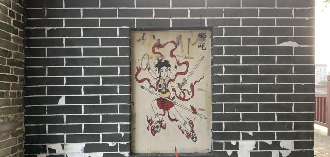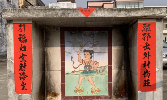 走进位山镇四九、昆阳、昆中等村庄,当地村民将哪吒佛像放置在村口门楼一侧,或粘贴长期瓷像(拼图)或在粉墙和木板上画画,并将其作为村里的守护神献祭。
