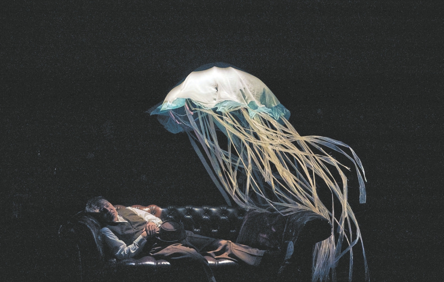 在《海底两万里》的舞美设计中,舞区中间的沙发后面有一个巨大的椭圆形舷窗,通过它可以看到海底世界的恍惚状态。埃克和莱索尔可以提前录制很多媒体视频在这里播放,但是他们选择了手工制作整个水下场景的舞蹈道具,你会看到蜘蛛蟹横着爬,可爱的灯笼鱼,晶莹剔透的水母……“我们非常接近手工艺行业。“埃克一再强调,他并不拒绝拥抱技术,但他的戏剧是一种出生的方式,应该和观众同时在同一个空间内一起完成。