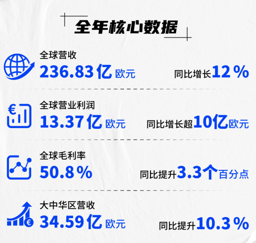 从2024年全年来看,阿迪达斯的全球收入为236.83亿欧元,在货币中性(相同)下,同比增长12%。;营业利润同比增长超过10亿欧元,达到13.37亿欧元;与去年同期相比,毛利率也提高了3.3个百分点到50.8%。