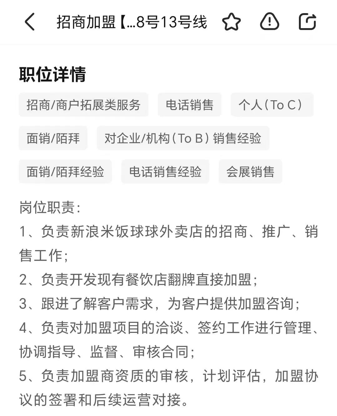 “在boss直聘中,”sina 新浪米的公司——农歌科技有限公司,不仅招聘设备维修工程师和测试工程师,还开设了餐厅经理、服务员等岗位,甚至专门设置了“招商新浪米球外卖餐厅”的岗位,可见“sina新浪米”的野心。