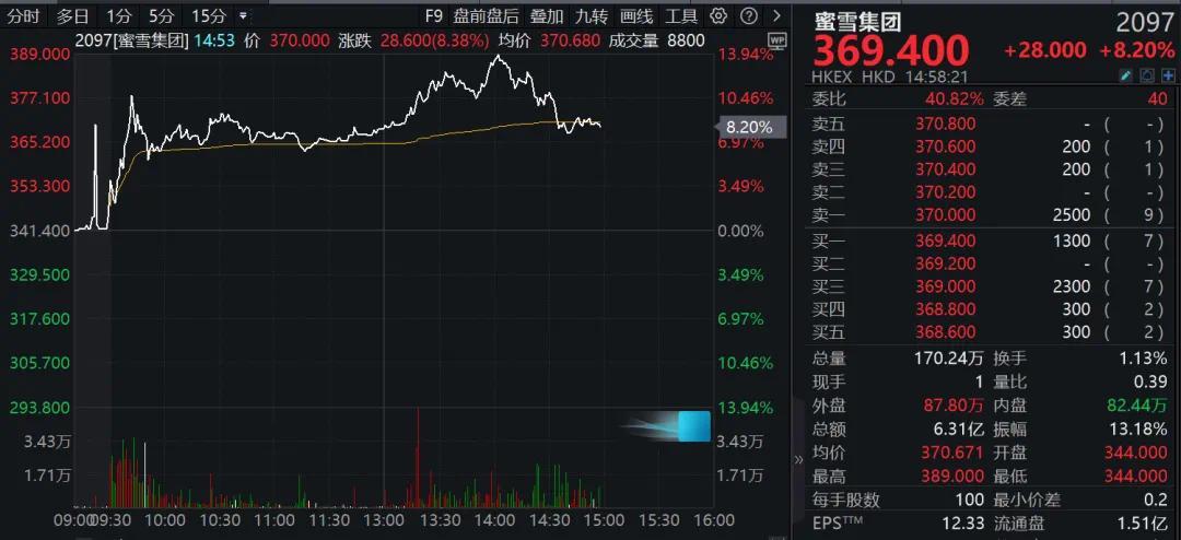 今日盘中一度涨幅超过13%,总市值直追1400亿港元,再创上市新高,港股蜜雪集团继续强势。