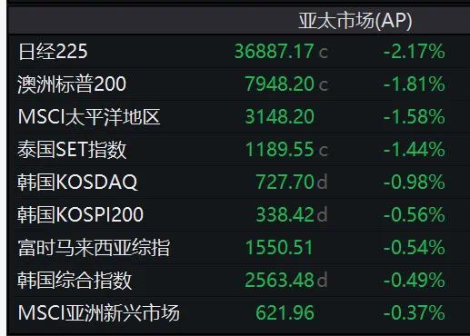 同时,亚太股指也集体下跌。日经225指数下跌超过2%,韩国KOSDAQ指数下跌近1%。