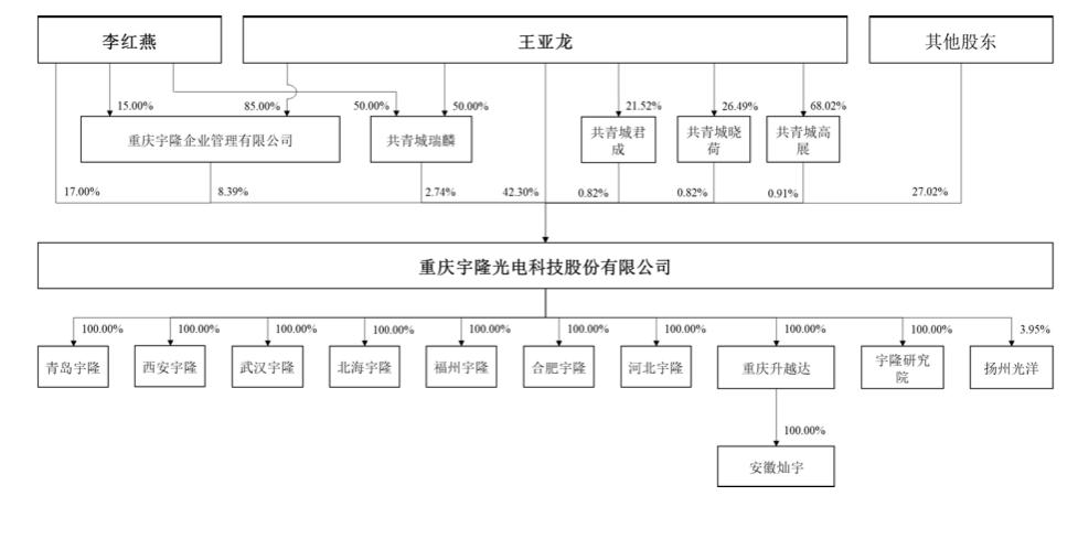 截至宇隆光电主板IPO招股书签署之日,王亚龙和李红燕直接持有59.31%的头寸,并通过宇隆企业管理、共青城瑞麟、共青城君成、共青城晓荷、共青城高展间接控制公司13.70%的股份,直接间接控制公司73.01%的股份。