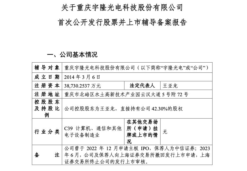 3月6日,重庆宇隆光电科技有限公司(以下简称宇隆光电)提交的上市辅导备案申请材料被重庆证监局受理,辅导机构为中信证券。