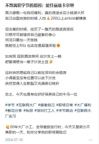 在社交媒体上,一位自称是00后的字节跳动员工晒出了酒店截图,说他不想辞职字节的原因是他可以住在丽思卡尔顿。她感叹道:“加班后,我回到酒店房间,躺在沙发上。我太舒服了,想做一辈子的沙发土豆。这时,我突然想起了我以前在深圳的合租房子。太小了,我甚至没有地方放下沙发。突然,我觉得生活是分离的,充满了幻想的转折点。”