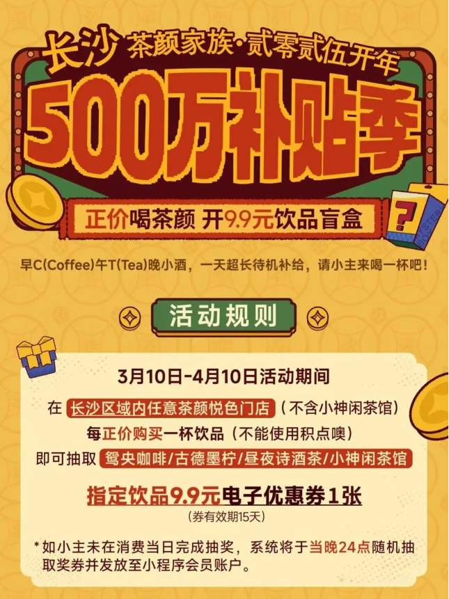 活动通过消费抽奖发放优惠券。每次顾客在长沙地区的茶店(不含茶馆)以正常价格喝一杯茶作品(包括外卖),都可以参加网上抽奖,随机获得9.9元茶家族子品牌专属内容的优惠券。如果消费者消费后没有抽奖,系统也会在同一天向客户账户发放优惠券。