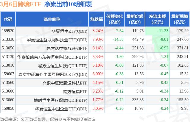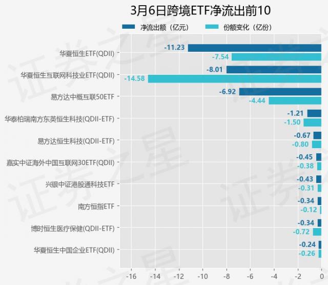 当天有 35 只跨境 ETF 资金净流出出现在基金中,其中华夏恒生排名第一。 ETF ( QDII ) (159920),份额下降 7.54 一亿份,净流出额为 11.23 亿元。