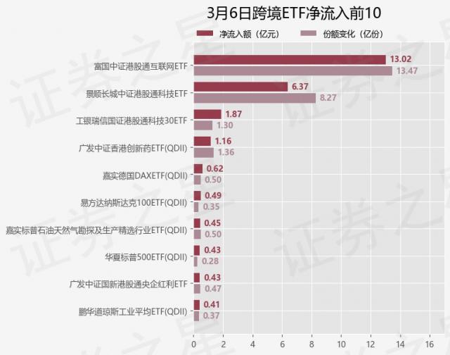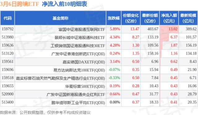 当天有 53 只跨境 ETF 资金净流入显示,其中净流入排名第一的是富国中证港股通互联网。 ETF(159792),份额增加 13.47 十亿份,净流入额为 13.02 亿元。