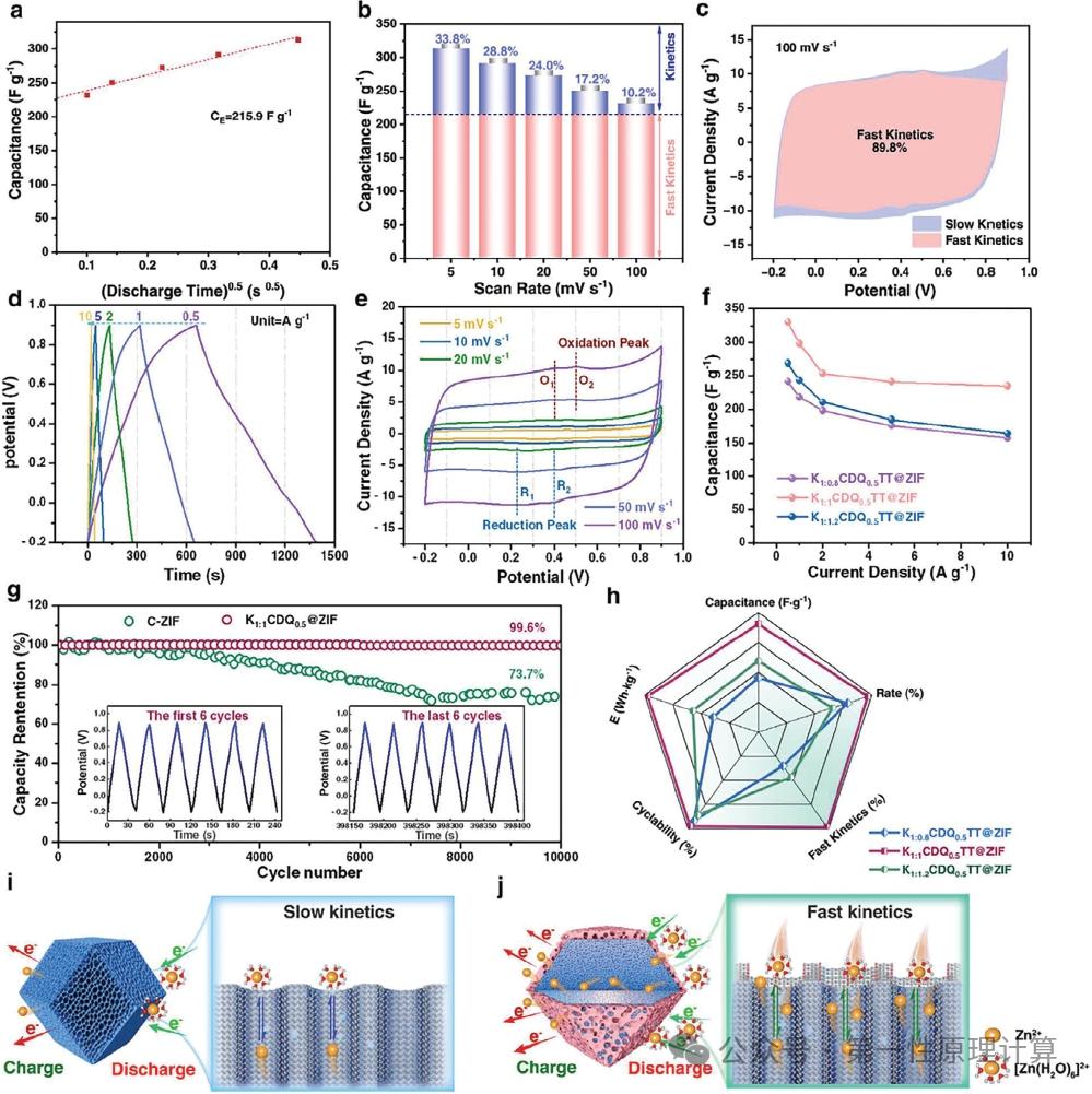 图5. a) K1:1CDQ0.5TT@半循环时间平方根与ZIF电容的关系。b) KOH活性比为1:一时的扩散奉献和电容奉献。c) 扫描速度为100 mV s−CV曲线总电流(实线)中的快速动力学区域(红色区域斜线)和慢速动力学区域(紫色区域)。d) GCD曲线和E在不同电流强度下) CV曲线的扫描速度不同。f) 在KOH活性比下,倍率性能不同。g) C-ZIF与K1:1CDQ0.5TT@在10000次循环中,ZIF的稳定性比较。h) 五种性能对比的雷达图,不同KOH活性比的碳超级电容器。i,j) ZIF-8衍化碳及梯度多孔碳超结构电荷存储示意图。