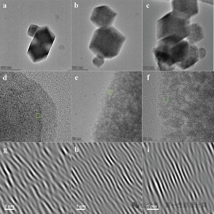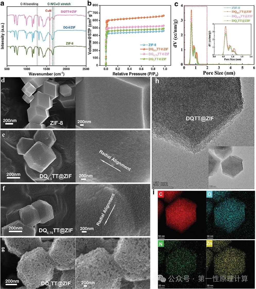 图2. a) FTIR光谱,b) N2吸附等温线,c) HK-BJH曲线(插图显示微孔分布扩大)。d-f) DQ含量(0.5, 0.75, 1 g L−1)下ZIF-8和DQTT@ZIF前体的HR-FESEM图像。DQTT@ZIF前体h) TEM和i) STEM图像。