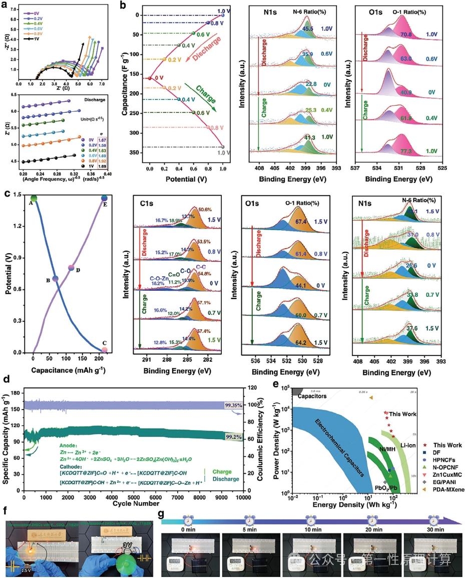 与以往的单层负极材料不同,研究人员设计的梯度孔超结构增强了电荷存储动力学,从而解决了单层碳负极低电荷存储动力学的难题。梯孔设计有利于水合锌离子的扩散和有效脱溶。在充电过程中,浓度梯度使锌离子迅速释放,在放电过程中有效捕捉,从而显著提高整体电荷存储动力学。其次,N通过形成C,/O共夹杂引入了额外的活性位点,-O-Zn键提高了锌离子的吸附能力。石墨化学提高了导电性、润湿性和表面反应性,而超高的SSA增强了可用的存储位置。简而言之,研究人员提出了加强锌离子存储器件中电荷存储动力学的综合策略,结合梯度孔、杂原子夹杂和石墨化,为高性能、稳定和可持续的储能解决方案铺平道路。