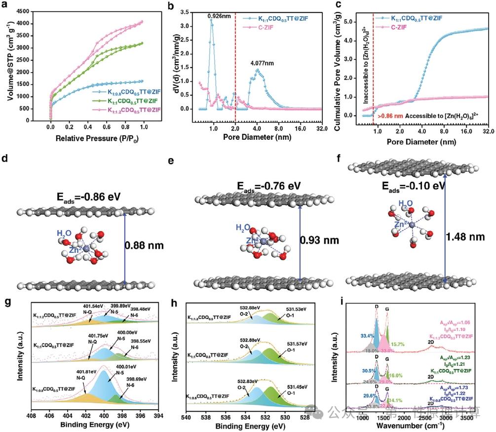 图3. a) N2吸附/分析等温线。b,c) K1:1CDQ0.5TT@ZIF与C-比较ZIF的孔径分布曲线。[Zn(H2O)6]2 离子体的层距分别为d) 0.88 nm、e) 0.93 nm和f) 1.48 用于NLDFT计算吸附能量的nm双层石墨烯吸附优化结构。g,h) 高分辨率N 1s和O 1s光谱。i) 与下梯度多孔碳超结构的拉曼图相比,活性不同。