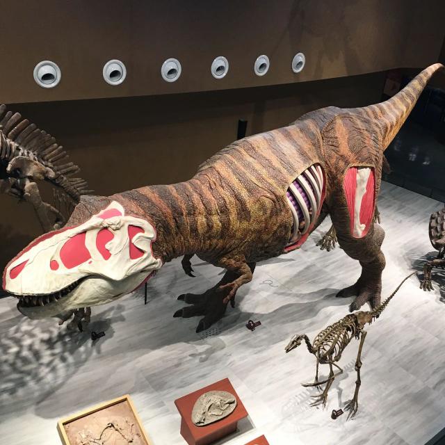 暴龙机电模型不仅忠实地再现了恐龙的真实造型特征,而且在头部、腹部和腿部也显示了半解剖结构,可以看到表皮下的骨骼、肌肉和内脏。,有一种解剖最恐怖食肉恐龙的感觉。