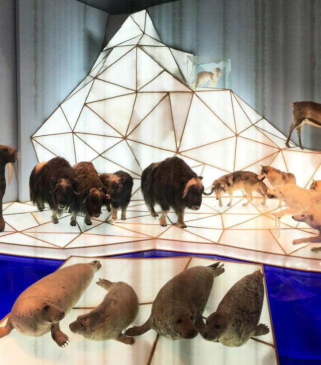 如果看腻了非洲,也可以去隔壁的【极地探索】主题区换个新世界。这里有几何冰川和冰面,上面有各种极地动物标本,包括北极熊、海豹、海象、麝牛、驼鹿和企鹅。