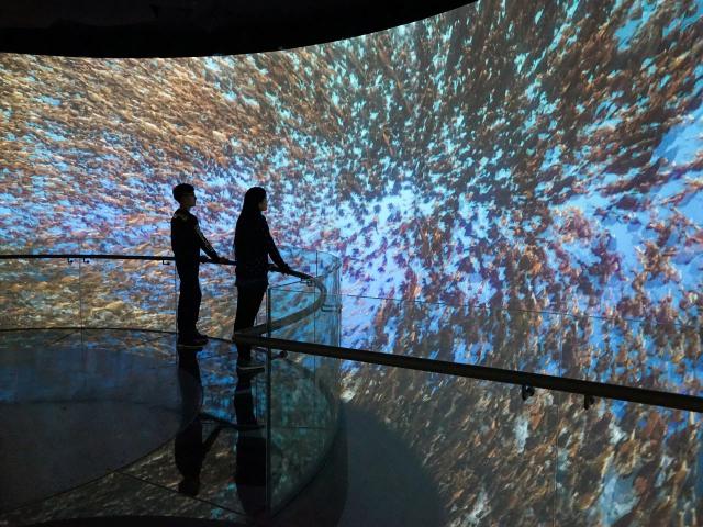 在这些剧场中,让人眼前一亮的是“寒武纪生命大爆发”剧场,剧院使用360 ° 球幕,寒武纪云南澄江生物群生态复原动画循环播放,并附语音讲解。