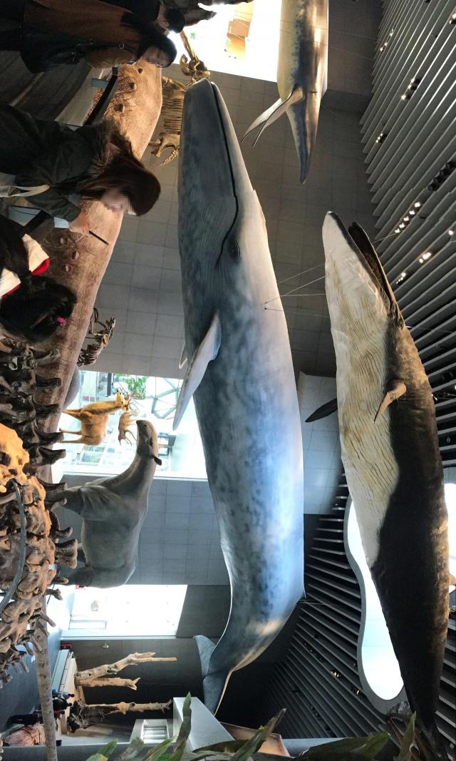 蓝鲸和长须鲸模型被挂起来展示。