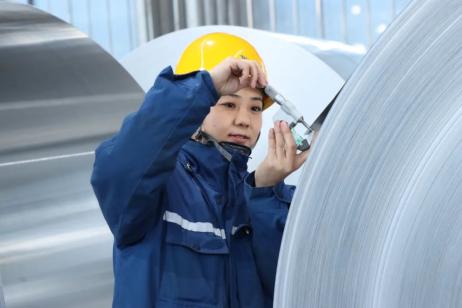 工作说明:内蒙古联晟新能源材料有限公司的女员工正专注于测量铝铂的厚度。