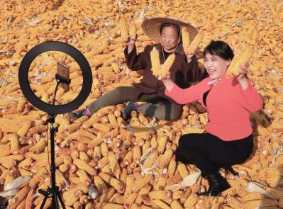 描述:秋天,农村迎来了丰收的日子。农民种植的玉米获得满仓,金黄色。两个农妇坐在玉米堆上,用手机直播商品,向社会传播丰收的喜悦。