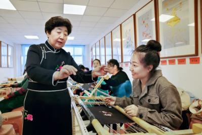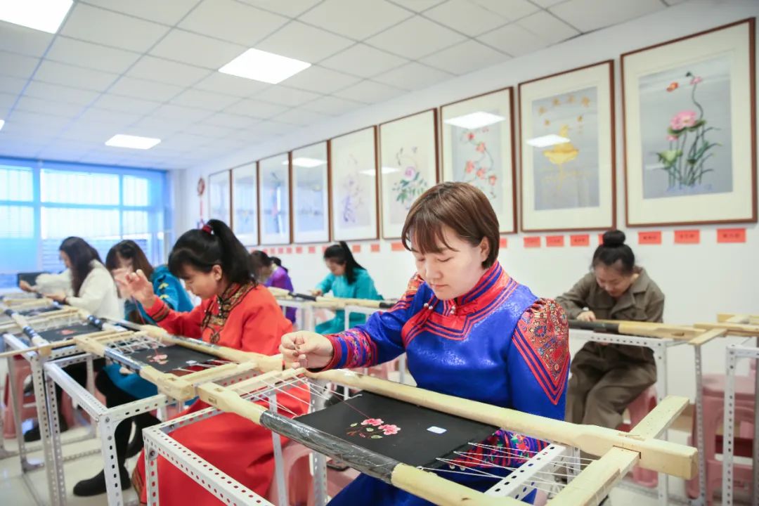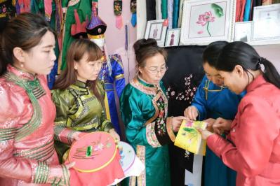 作品说明:蒙绣非遗传传承人乌云其格老人正在向徒弟们传授技艺。