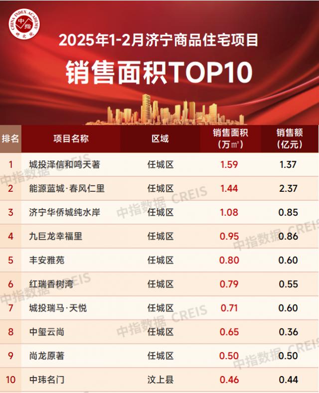 2025 年 1-2 月份,济宁商品房销售面积 TOP10 总销售面积为 9.18 万平,排名前三的项目销售面积都超过了。 1.08 万平。在这些人中,城投泽信和鸣天荣登销售面积冠军,销售面积 1.59 能源蓝城万平; · 清风仁里以 1.44 万平位列第二;济宁华侨城纯水岸 1.08 万平的销售业绩紧随其后。