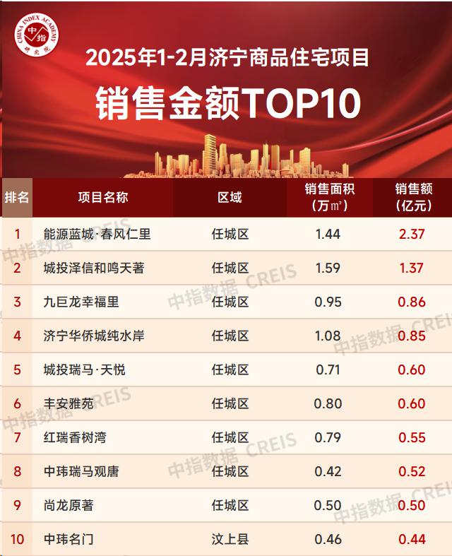 特别声明:房地产企业销售数据统计是 2025 年 1-2 月度销售的商品房为统计口径,主要根据济宁市城区(不含县市)中指研究院的销售统计数据,参照企业提供的相关数据,公司提供的相关文件也包含在少数未在监测范围内的项目的统计范围内,经审核纳入统计范围,集中在线签约的已售罄项目不列入名单。本次列表仅供参考,研究小组对使用列表及其内容造成的任何直接或间接损失不承担责任。