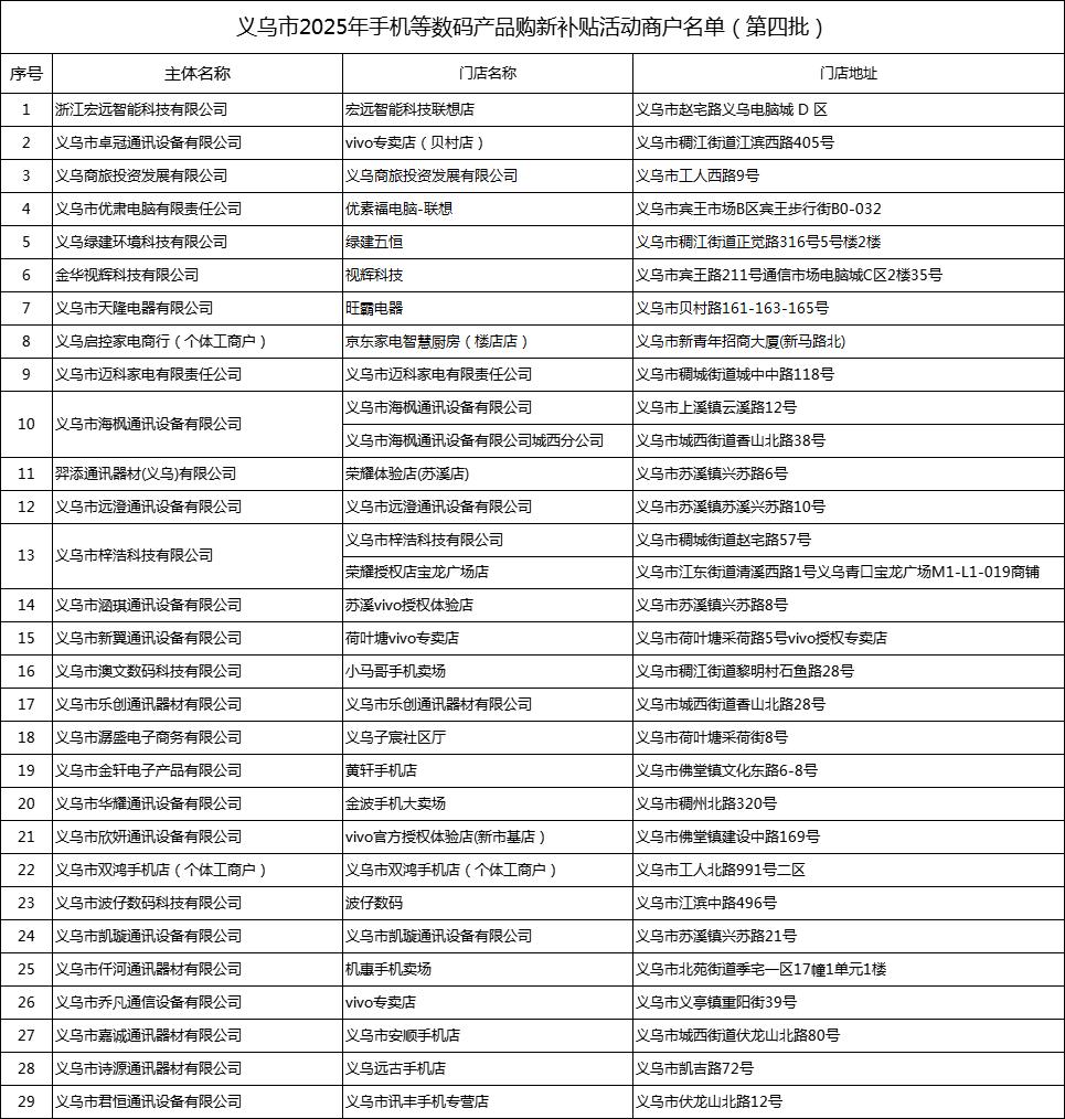 自3月6日起,共有29家商户正式参加义乌市2025年手机等数码产品购买新补贴活动,作为第四批商家。