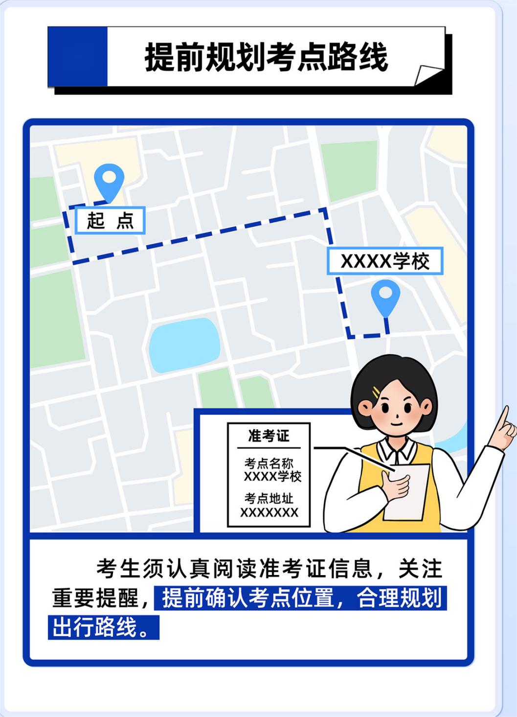 考生要密切关注天气变化和交通状况信息,合理安排出行计划,注意人身安全;提前熟悉考点的位置和交通线路是非常必要的。建议考前一天去考点实地考察,这样可以更直观的感受到旅行所需的时间和可能出现的交通问题。