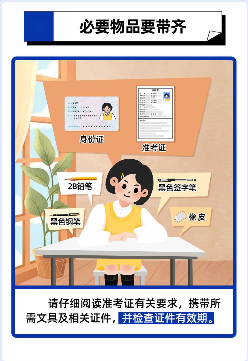 考试当天,考生必须持有有效居民身份证原件和纸质准考证(或临时居民身份证)参加考试,两者缺一不可。每个人都必须仔细检查居民身份证的有效期。如果发现考试当天证件过期,请提前到相关部门补发,以免因证件问题无法进入考场,错过考试机会。