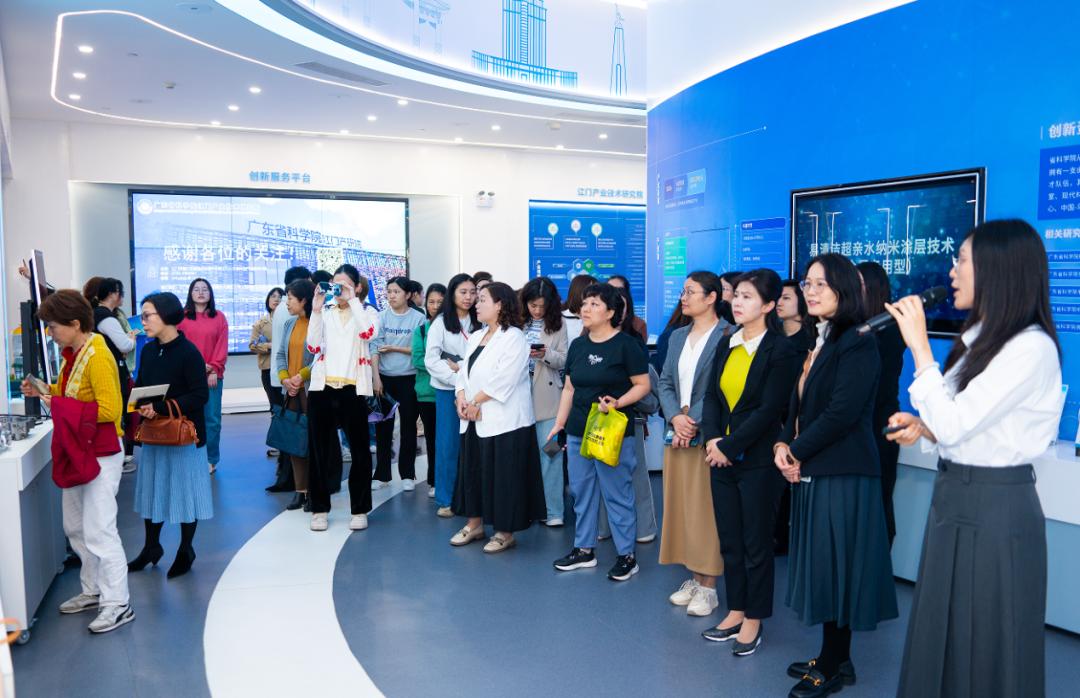 参与者参观了位于江门市火炬高科技创业园的科技成果展厅,听解说员讲解了江门市近年来各行业的科技创新成果。