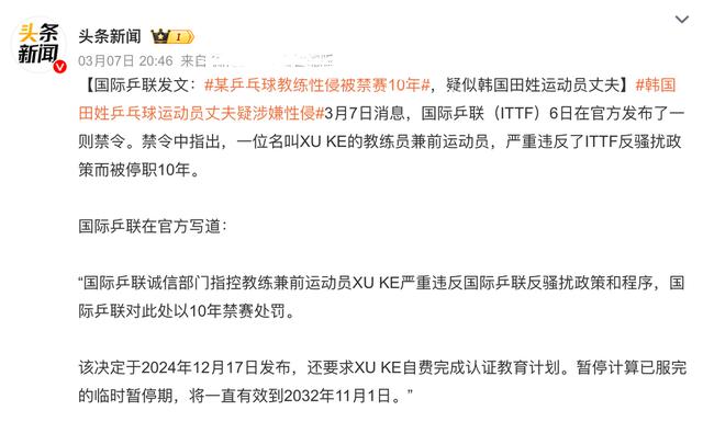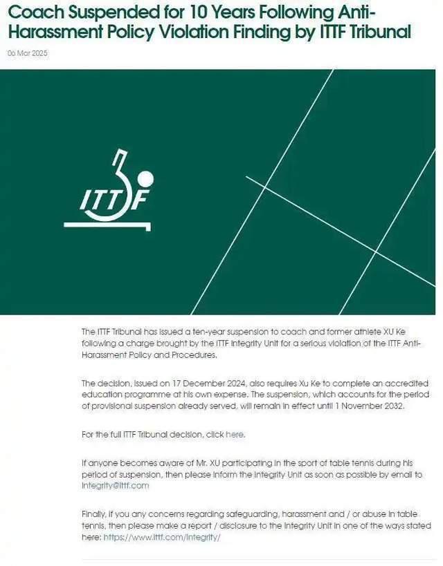 国际乒联于 3 月 6 日本在官方网站上发布了一个禁令。禁令中提到,一个名字。 XU KE 教练兼前选手,严重违反了 ITTF 因反骚扰政策而被停职 10 年。