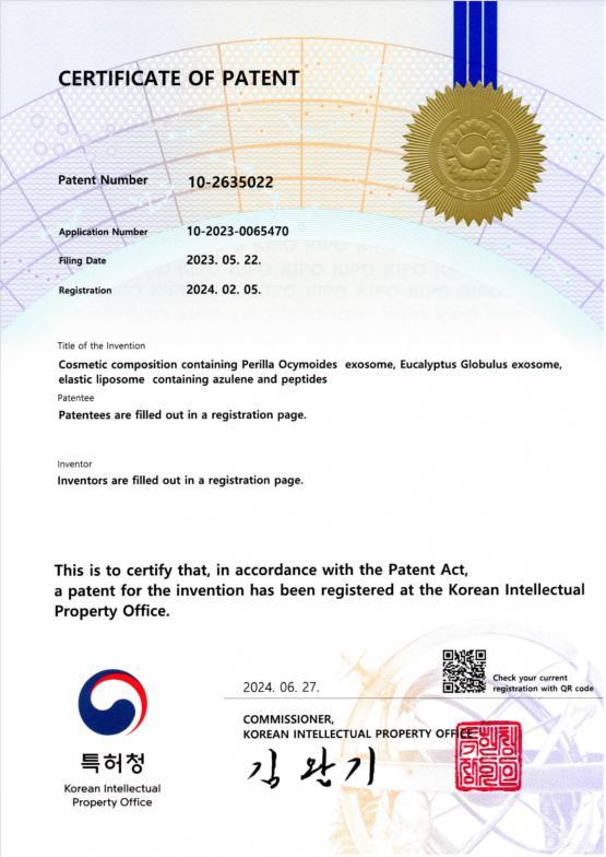 R4 舒缓修复配方 德妃专利证 ( 第 10-2635022 号 )