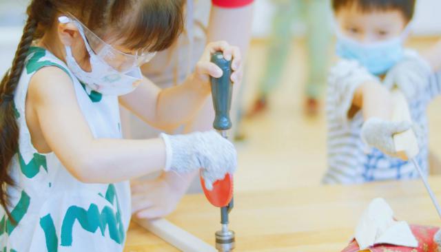 在幼儿园,孩子们可以穿自己的衣服,熟悉用筷子吃饭,用积木建造复杂的东西,如高楼大厦、桥梁和城堡,用粘土捏出小动物和水果。