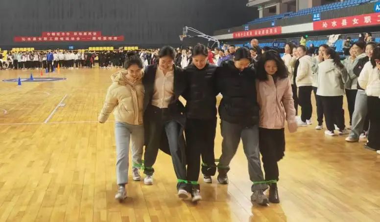 她们两组相邻的腿绑在一起,齐心协力,脚步协调,笑声中展现出团队的默契和活力。