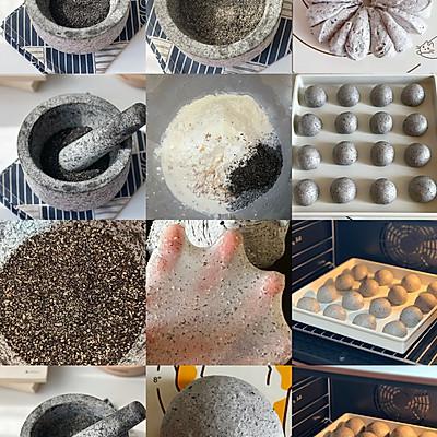 1、黑芝麻用石磨捣成粉备用 除黄油、盐外,将所有食材倒入厨师机桶中,低速揉至无粉末,转中高速揉至锯齿膜 在手套膜中加入黄油和盐。 取出排气,团圆后放松。 20 分钟 把平均面团分成两部分 16 分,团圆后放入烤盘中,醇化至两倍大。
