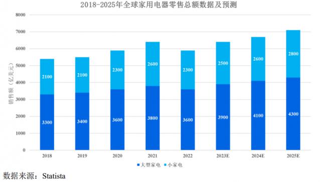 根据 Statista 数据,2022 全球白色家用电器、厨房电器和小型电器的预计销售额 5,900 亿美元。估计到了 2025 年度,全球销售额为 7,100 亿美元,复合增长率为亿美元 4.7%。