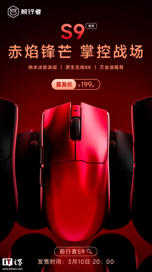 IT 世家 3 月 8 日消息,前行者现已在京东上架。 S9 Pro 三模游戏鼠标“红焰红”版本,其配置 PAW3395 芯片,定价为 199 元,将在 3 月 10 日晚 8 点首销。