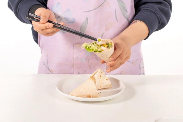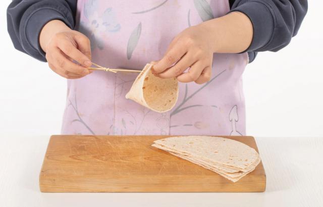1. 把粗粮卷饼切成两半,卷起来用牙签固定,烤箱 180 ℃烤 5 每分钟定型,取下牙签。