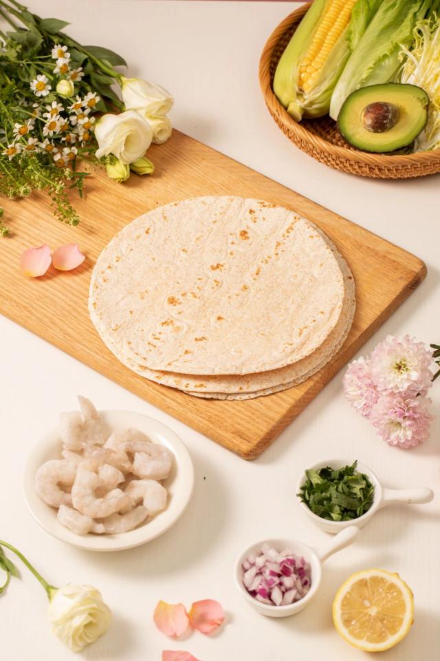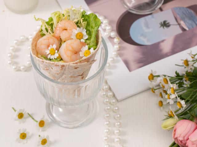 几个粗粮卷饼,虾仁 300 克、牛油果 2 生菜,苦菊各种 50 适量玉米、香莱碎、洋葱碎、柠檬汁、米酒、鸡精调味料。