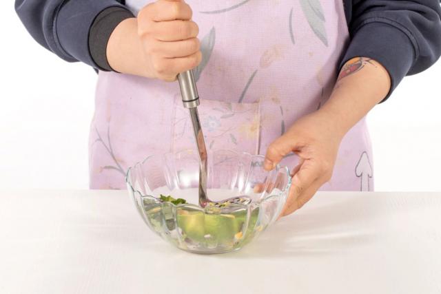 4. 在牛油果中加入柠檬汁和玉米,再加入香莱碎、洋葱碎,碾成泥备用。