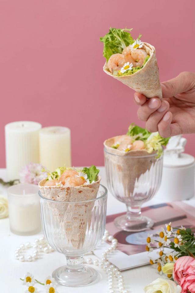 5. 在粗粮饼里先铺上生菜和苦菊,塞上牛油果泥,再叠上虾仁,用花装饰即可。