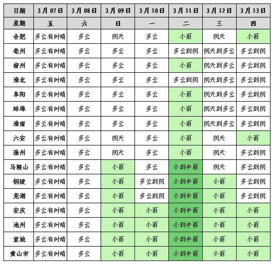 11日(周二):淮北地区多云至阴天,部分地区有小雨;淮河以南阴天有小雨,部分地区有中雨。