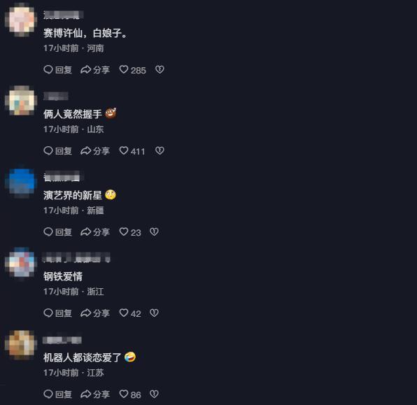 有些网友看后调侃道:“赛博许仙,白娘子”“机器人都恋爱了”“钢铁感情”等等。